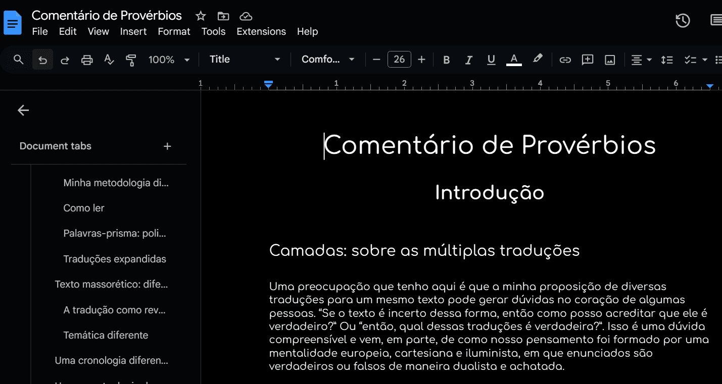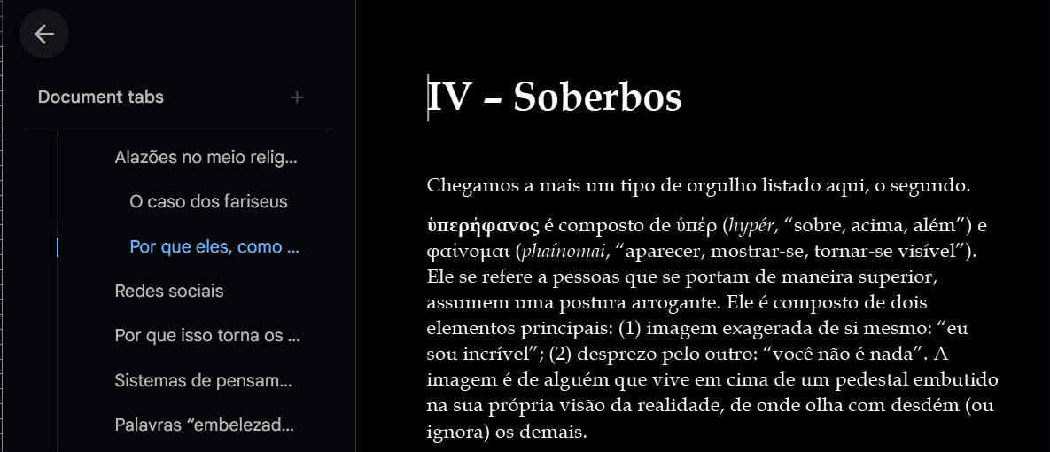 At the moment, I’m working on a few longer texts: the first is a commentary and word study on 2 Timothy 3:1-5, where I try to unveil the meaning of each word listed by Paul in the passage and then apply it accurately for our time. The second one is a lengthy comment on the state of Christianity today and how it drifted from the Scriptures. The third one, which I began on September 2025, is both a translation and commentary on the Septuagint version of the Proverbs of Solomon. For each proverb, I provide one to three Portuguese translations directly from the Greek, to capture different nuances or interpretations. I then add commentary and practical application. The Lexham Interlinear Septuagint on Logos has been incredibly helpful with this, and I'll soon add an entry on this website commenting on different aspects of translating proverbs.